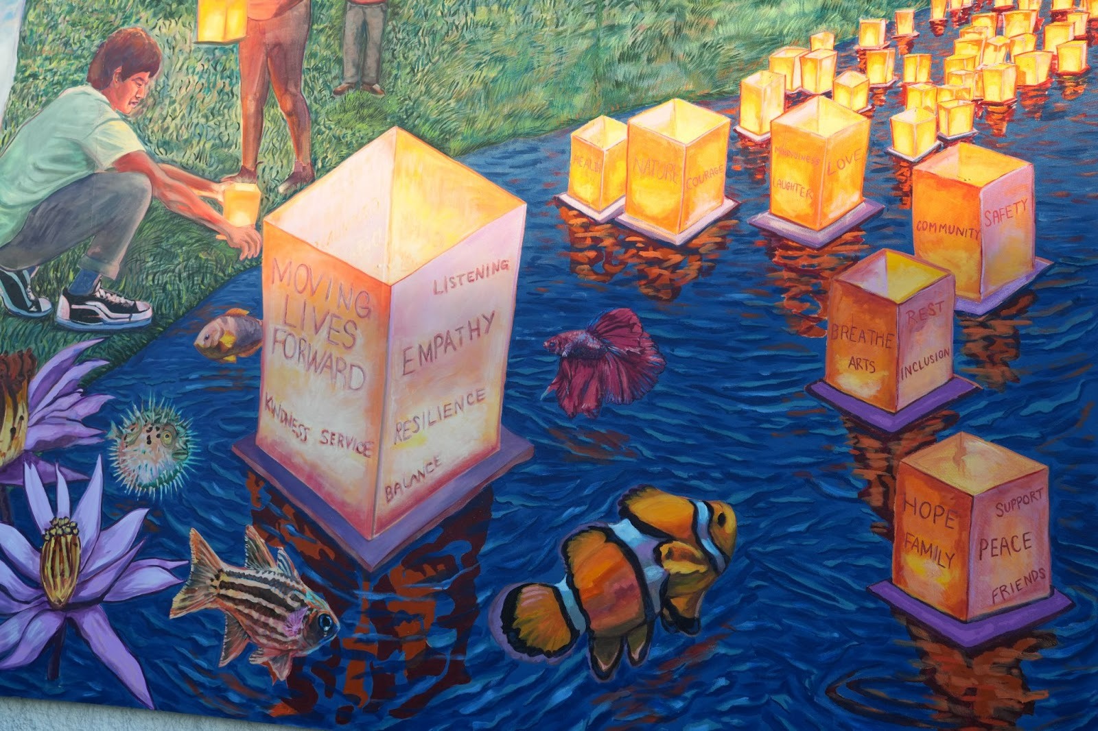 Created by Carlos Rogel, “Sunset Luminaries” reflects themes of peace, empathy, and inclusion, which are values central to the Center’s mission of providing both mental health services and support to anyone experiencing bullying, bias-related harassment, or hate violence. The mural stands as a bright reminder of what is possible when communities come together to replace fear with understanding and isolation with hope.