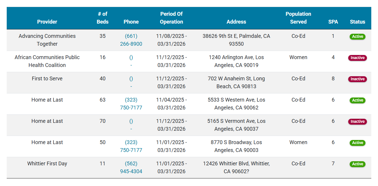 The Winter Shelter Program has resumed on November 1, 2025, with very limited congregate shelter availability at the start of the season. Currently, four sites are active. Sites Whittier First Day, Home At Last Western, and Home At Last Vermont are at capacity, with no availability. Only site provider Advancing Communities together has available beds at this time. Additional shelters and beds will open as the season progresses.