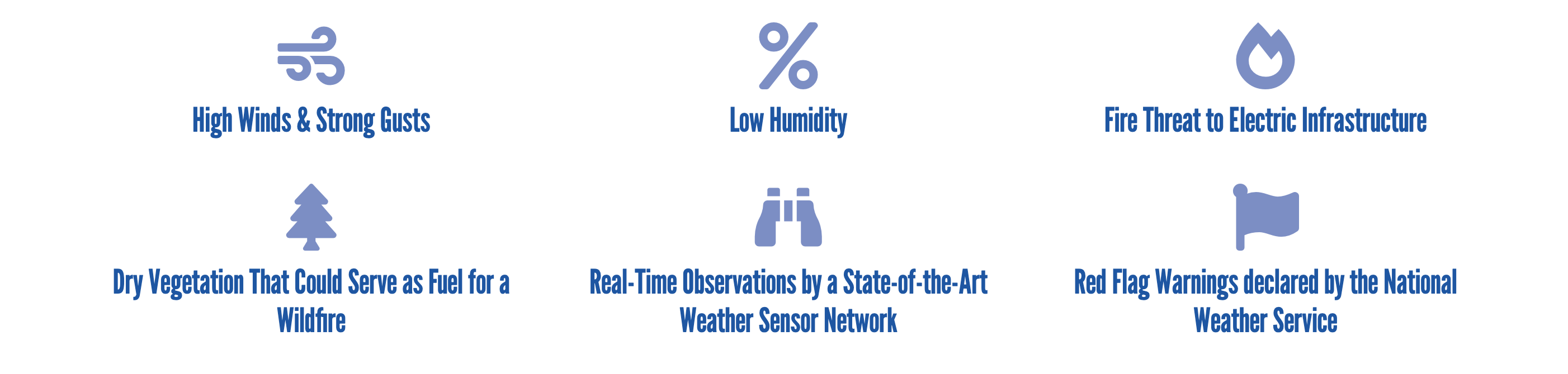 Elevated weather conditions can cause vegetation or other items to be blown into power lines, possibly creating a wildfire. Under these situations, utility companies may temporarily shut off power to customers to keep you and your community safe. Utility companies consider a number of factors and conditions before declaring a PSPS. These include, but are not limited to: